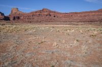 This stock photo captures the stunning Utah desert landscape with brown bedrock and abundant vegetation. The rugged terrain blends seamlessly with the clear sky and fluffy clouds on the distant horizon. The image showcases the iconic Canyonlands region near Hurrah Pass and Kane Creek Road in Moab, USA. The vibrant red rocks and sandy dirt roads provide a captivating contrast to the lush grass and gravel surfaces. The low mountain ranges in the background add to the natural beauty of this open space. This daytime shot perfectly depicts the raw beauty of the desert, showcasing the intricate details of the grass and surface textures. Nature enthusiasts and off-road enthusiasts will appreciate the picturesque track that winds through the Utah landscape.
