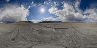 a desert area with cracked rocks and mountains under a partly cloudy sky, some clouds behind