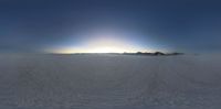 A serene desert landscape in Utah at dawn, with the sun shining down and casting a golden light. The flat, snow-covered surface creates a calm and emotional atmosphere. The clear sky and distant mountains complete the picture.