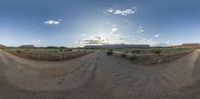 three 360 - cameras, showing a dirt road passing by on one side and mountains beyond
