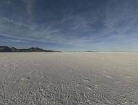 Early morning in Utah's desert landscape. The calm sea of sand stretches to meet the mountains on the horizon. The atmosphere is still, with scattered clouds and contrails above. A serene and emotional connection to nature.