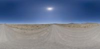 an arid desert scene with road and sky in the background with very no clouds at all