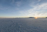 A stunning sunset over the Salt Lake in Utah, with mountains in the distance. The expansive ice-covered open space reflects the vibrant colors of the sky. Contrails create a dramatic effect on the cloudy horizon.