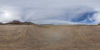 a 360 - camera image shows the desert with dirt roads and large mountains and clouds