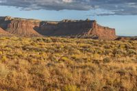 large field with brown plants and red rock formations in the background and blue skies above