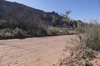 a dirt road in the desert with a mountain in the background with trees in the foreground