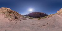 a panoramic view of a narrow river in the desert with red rocks, shrubs and a blue sky