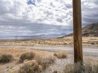 an old utility pole in a desert landscape next to a dirt road with mountains in the background