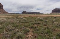 A scenic off-road track in Utah's desert landscape. The red rocks and rugged terrain create a stunning natural environment. The grey sky contrasts with the vibrant colors of the sand and mountains in the distance.