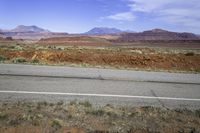 A scenic drive through the desert landscape of Utah. The red rock mountains and grassy plains create a beautiful contrast against the clear blue sky. The road winds through canyons and along the shores of Lake Powell.