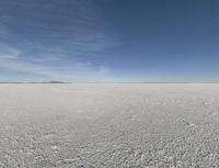 This image captures the unique landscape of the Utah desert. In the foreground, a lone person stands on a large ice-covered field, surrounded by the vast expanse of the desert. The contrasting elements of sand and ice create an emotional atmosphere in this natural environment. In the distance, mountains rise against the clear blue sky, while the surface of a salt lake glistens in the sunlight. The picture also features the presence of contrails, adding to the sense of solitude and tranquility. This photo represents a typical day in the Utah desert.