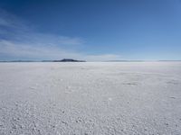 the large expanse of flat snow in the desert under blue skies with mountains in distance