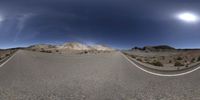 A deserted road in the Utah desert, surrounded by stunning red rock landscapes and majestic mountains. The straight road stretches into the horizon, offering a perfect road trip experience. A tranquil and rugged natural environment in the San Rafael Swell.