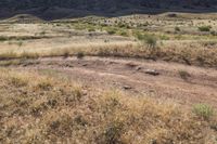a person riding a bike on a dirt trail surrounded by tall grass and brown hills