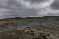 A rugged off-road track in the highlands of Utah. The elevated landscape features high mountain landforms and hills. The gravel and dirt surface contrasts with the green grass and vegetation. Clouds hug the horizon.