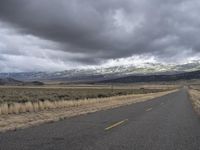 A scenic view of a road winding through the highlands of Utah. The road stretches towards the horizon, surrounded by majestic mountains and vast plains. A grey sky adds drama to the landscape. In the distance, a freight train travels along the railway.