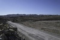 A highland road in Utah, winding through the rugged terrain of the San Rafael Swell. Gravel road surface leads to a distant landscape and mountain range. Clear sky and highland formation create a picturesque scene.