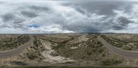 some clouds are over the dirt road and mountains with two curves in it and the sky has a blue cloudy