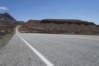 A low desert landscape in Utah, USA. Red rock canyons and clear skies create a stunning backdrop for a road trip through the canyonlands. Asphalt thoroughfares wind through the geology of the badlands.