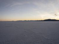 A calm evening at Bonneville Speedway in Utah, with the clear sky reflecting on the salt surface. The open space and desert landscape provide a serene atmosphere. Contrails paint the horizon as dawn breaks over the ocean.