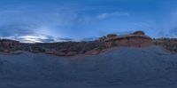 there is a view of the rocks and a cloudy sky at sunset as seen through a fish eye lens