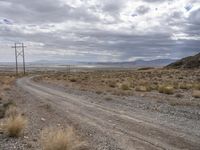 This is an image of a road in the highlands of Utah, USA. The landscape is characterized by the endless stretch of rugged desert and steppe, with dryland vegetation scattered throughout. The road is made of dirt and gravel, and is surrounded by plain land lots and trees. Overhead power lines run parallel to the road, providing infrastructure for the area. The view is overlooking Salt Lake City in the distance, with a grey sky overhead. This photo captures the natural environment and remote beauty of Utah's rural and off-road tracks.