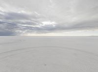 A dramatic landscape in Utah, with a grey sky hanging above a vast plain of sand. The surface bears the marks of vehicles, adding to the intrigue of this natural environment.