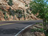 A scenic road in Zion National Park, Utah. The asphalt winds through the picturesque landscape, framed by majestic mountains. Clouds dot the clear blue sky on a beautiful day in nature.