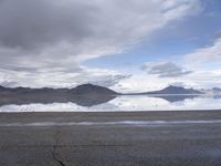 a road in the middle of nowhere is pictured in this photo with a mountain reflected on water