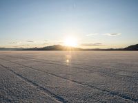 A sunny morning at Bonneville Speedway in Utah. The clear sky illuminates the Salt Lake City landscape, with mountains visible in the distance. The vast open space and salt surface create a serene and inviting desert atmosphere.