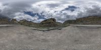 a skate park with lots of empty ramps and lots of mountains in the background and clouds