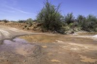 This image captures the breathtaking landscape of Valley of the Gods in Utah, USA. The clear sky highlights the red rock formations and rugged terrain. A meandering road, made of asphalt and gravel, curves through the low, wet vegetation. The road surface showcases the contrast between the dirt and the grass. In the distance, a stream crossing and fluvial landforms of streams add to the natural beauty of the area. Above, contrails streak across the sky. This photo embodies the natural wonders and rugged beauty of Canyonlands National Park in Utah.