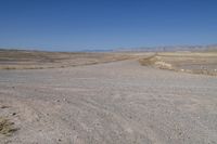 This is an image of a dirt road winding through a dry desert plain in Utah, USA. The landscape features low-lying red rock formations and open spaces. In the distance, a mountain range is visible against a clear blue sky. The road surface consists of dirt and gravel, reflecting the aeolian landforms and geology of the area. This photo captures the vastness and beauty of the desert terrain in Utah.