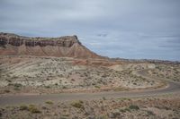 A long, straight road in the desert of Utah, surrounded by majestic mountains and red rock formations. The elevated landscape showcases the unique Aeolian landforms and geology of the region. A gloomy day under a grey sky adds an ethereal atmosphere.