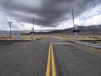 A scenic view of a straight road surrounded by majestic mountains in Utah, USA. The grey sky adds an air of mystique to the rural landscape. The road leads to Salt Lake City, passing through untouched wilderness and rail crossings.