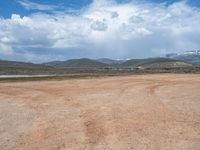 A scenic view of the rural landscape in Utah, USA. Open spaces surrounded by mountains and nature. Clouds dot the clear blue sky above the dirt and gravel surfaces, creating a peaceful and serene atmosphere.