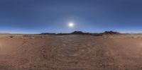 a wide panoramic photograph of a desert landscape with sun behind it and mountain peaks in the distance