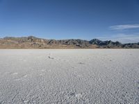 This is an image of the Utah desert in the USA. The vast open space is surrounded by mountains, creating a stunning landscape. The dry, sandy terrain contrasts with the clear blue sky and the distant mountain range. In the foreground, there is Salt Lake City, with its iconic Salt Lake visible in the distance. The natural environment provides a peaceful and wilderness-like atmosphere. The image captures the unique beauty of this highland plain, with the Bonneville Speedway visible on the horizon. It represents a typical day in Utah's mountainous region.