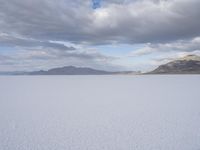an open plain covered in white snow under a cloudy sky and mountain range behind the horizon