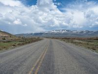 Straight stretch of asphalt road cutting through the rural landscape of Utah. Majestic mountains tower in the distance, contrasting with the expansive blue sky. A picturesque day in the USA.