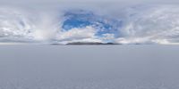 a lone horse is walking across the vast open field that leads to an island beneath the clouds