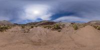 a large desert with some dirt and dirt piles on the ground and one person in the distance