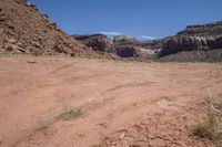 Off-road adventure in Utah's Canyonlands. Rugged mountain ranges and red rock formations create a stunning landscape. Dirt road winds through the valley, surrounded by brown bedrock and grassy slopes under a clear sky.