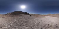 A rugged terrain in Utah, with a large mound of rocks in the foreground and the moon shining in the center. The red rock landscape of San Rafael Swell is illuminated by the clear sky.