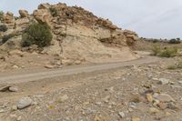 A gloomy day in San Rafael Swell, Utah. The grey sky contrasts with the red rock landscape and the sand street. The mountain slopes and formations create a dramatic backdrop for the off-road track and dirt road. Erosion has shaped the canyons and created unique rock outcrops.