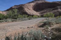 A scenic drive on a dirt road through the red rock landscape of Utah. The rugged terrain and clear sky make for a perfect off-road adventure. Explore the desert wilderness and experience the breathtaking beauty of the canyonlands.