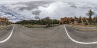A scenic road in Utah, USA, cutting through breathtaking red rock mountains. The straight road leads the eye one quarter of the way before disappearing into the stunning landscape. Clouds dot the clear blue sky.
