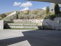 A modern residential home in Salt Lake City, Utah. The concrete architecture stands out against the clear sky, casting hard shadows on the surface. Nearby, a line of stone walls and office buildings create a suburban business district.