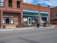 A classic architecture cinema in a rural town in Utah. The road lined with storefronts leads to a vibrant shopping area. The clear skies and urban landscape create a picturesque scene.