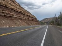 A road in Utah, surrounded by a gloomy forest and mountains. The grey sky adds to the somber landscape. Nature and asphalt blend, creating a mysterious atmosphere. Perfect for any USA road trip.